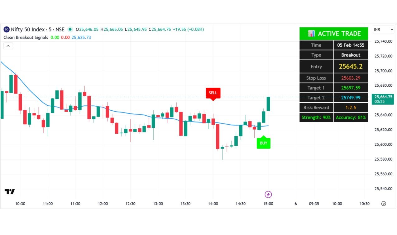 Entry price, stop loss, and target — all automatically calculated and displayed.
